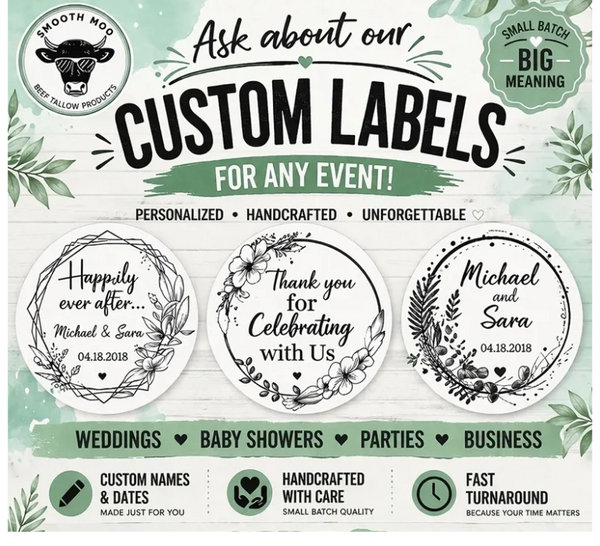 Stand out and make your tallow products truly yours. Email us at Order@smoothmoo.shop or call 417-296-9608 to get started.